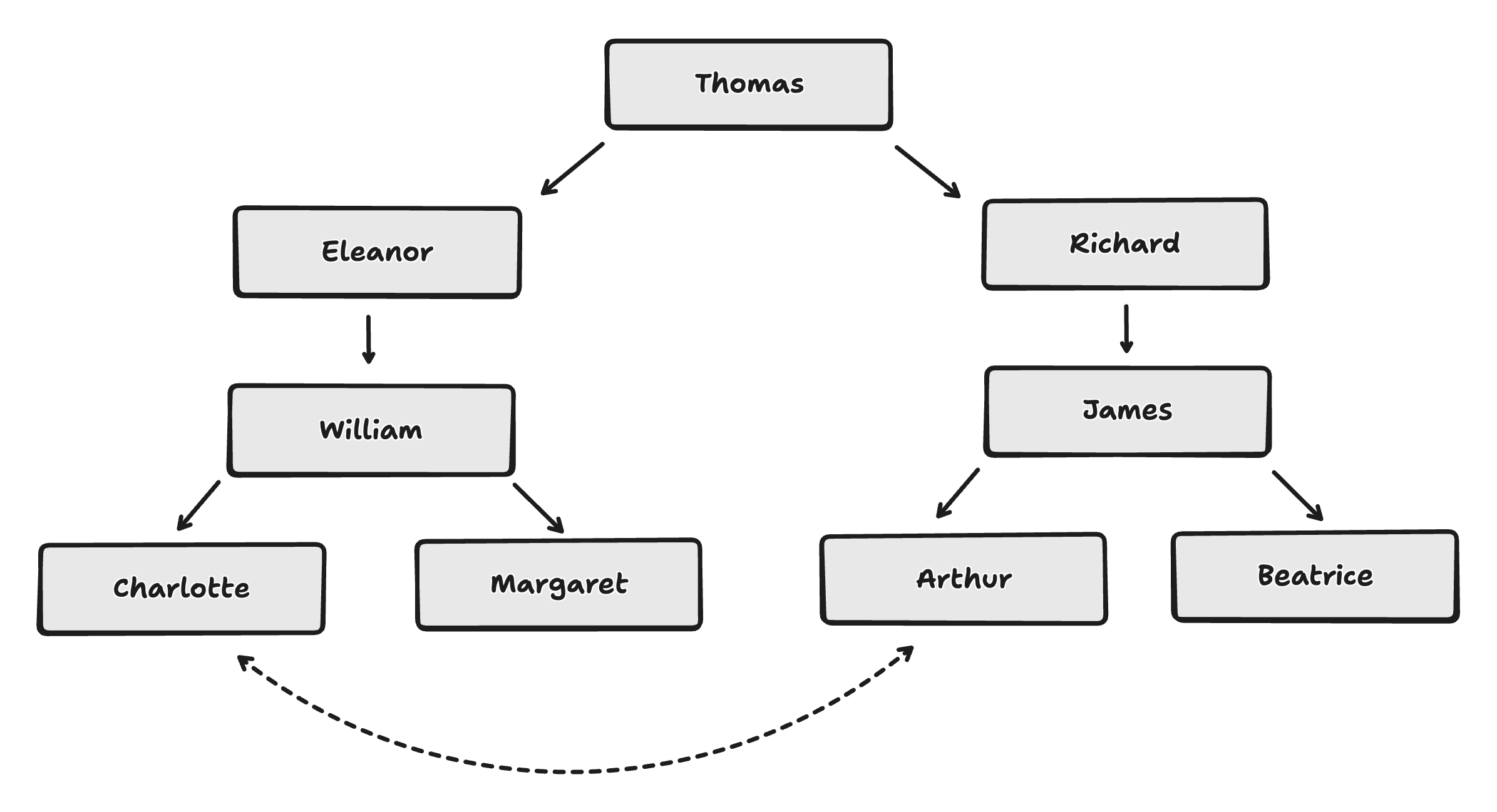 “Thomas, who was the father of both Eleanor and Richard, had a grandson through Eleanor named William, who in turn had two daughters, Charlotte and Margaret, while Richard had a son named James, who was the father of both Beatrice and Arthur, the latter of whom married William’s daughter Charlotte.”
